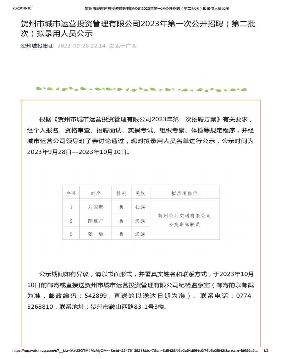 贺州市城市运营投资管理有限公司2023年第一次公开招聘(第二批次)拟录用人员公示2023-09-28