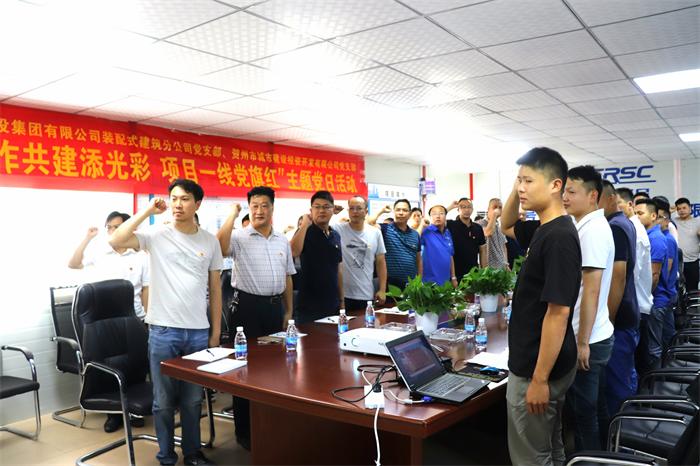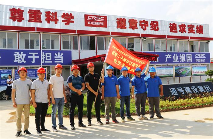 5月18日下午,通号建设集团有限公司装配式分公司与贺州市城市建设投资开发有限公司党员在贺州市平桂区鹅塘镇第二初级中学整体迁建项目部联合开展“合作共建添光彩,项目一线党旗红”主题党日活动。活动先后进行了集体重温入党誓词、党的“十九大”知识竞赛、党员先锋岗授旗、拔河比赛以及集体种植草坪等。通过此次活动,通号公司与城投公司员工增进了友谊,加深了感情增强党员职工勇争先进、团队合作的精神。