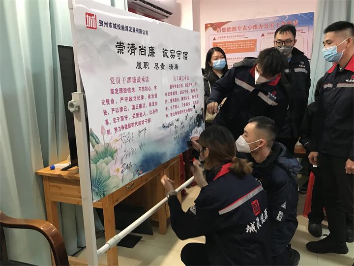 活动最后全体干部职工集体在《崇清尚廉 诚实守信》廉洁承诺展板上签名。