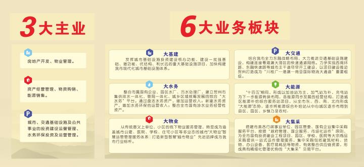 城投集团立足战略布局,持续优化布局结构,主责主业更加突出。2021年,根据市委部署要求,城投集团与原交投集团进行重组合并。合并后的城投集团定位为以承担基础设施投资建设、提供公共服务和产品、土地开发经营利用为三大核心功能的经营实体。根据三大核心功能定位,城投集团研究确定了“三大主业六大板块”的发展思路,提出“大基建、大交通、大水务、大能源、大物业、大集采”等六大转型发展新板块,同步推进建筑材料贸易、贺州智慧停车、金融押运、小额贷款、特许经营等辅助业务,支撑核心业务发展,做大现金流、做强企业实力、做优企业资产。