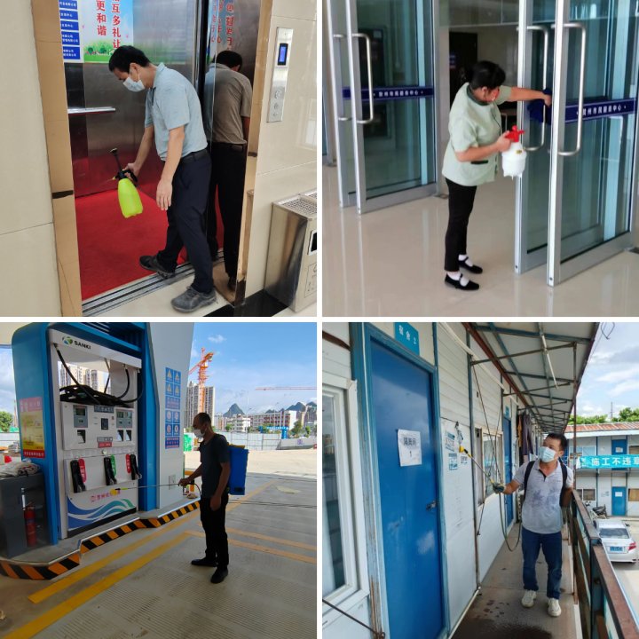 消杀人员全面对集团办公区域楼道、会议室、卫生间等部位进行环境消杀,对办公室门把窗锁、电脑键盘鼠标、座椅扶手等频繁接触部位进行清洁消毒;对物管小区大门、单元入户门、小区绿化带、楼梯通道、电梯轿厢、楼梯扶手、垃圾桶、信报箱等各公共区域进行全面擦洗消毒,及时清运小区垃圾,清理卫生死角;对平安立体停车库、平安加油站、姑婆山小镇路花新村项目、城东污水处理厂项目等开展防控消杀。仅一天时间,城投集团共消杀办公场所处,项目工地个,物管小区个,进行了“无死角、无盲区、全覆盖”的地毯式消毒作业。