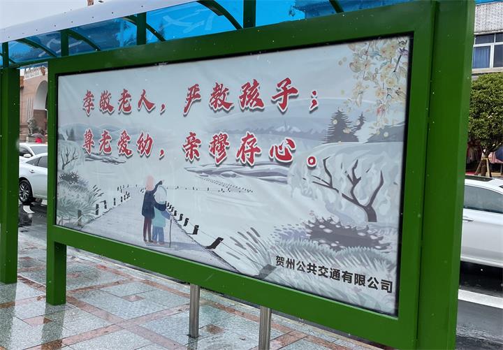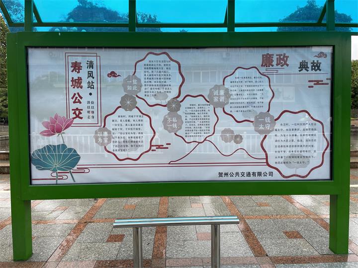 二是建设“寿城公交清风站”。选取灵峰广场、贺州市教育局公交站台,将廉政典故、家庭家教家风建设、创建文明城市等内容融入公交站台宣传版面,在潜移默化中使廉政文化在市民心中生根发芽,最大限度地发挥了文化润廉的良好作用。