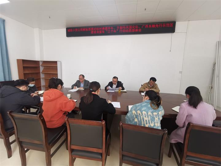 小贷公司召开本公司“三个年”动员部署会,要求公司上下要进一步解放思想,强化作风建设,重实效、强实干、抓落实,以“三个年”活动为抓手,聚焦信贷业务发展加油干、强化风险防控不松劲、改进干部作风不停步,以作风的转变推动公司高质量发展。