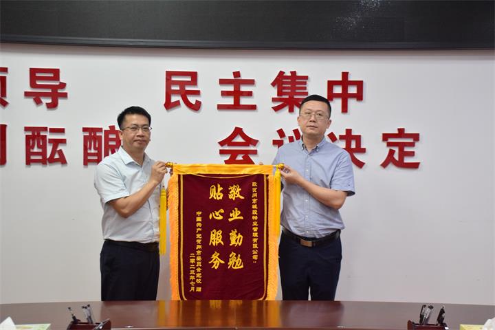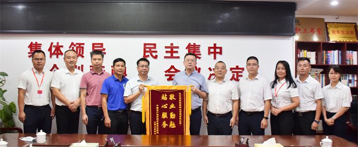 7月12日下午,贺州市市委党校副校长唐永波一行来到城投集团,将一面印有“敬业勤勉 贴心服务”的锦旗和感谢信送到了城投集团党委委员、副总经理陈桂军手中,为城投物业公司高质量服务点赞。
