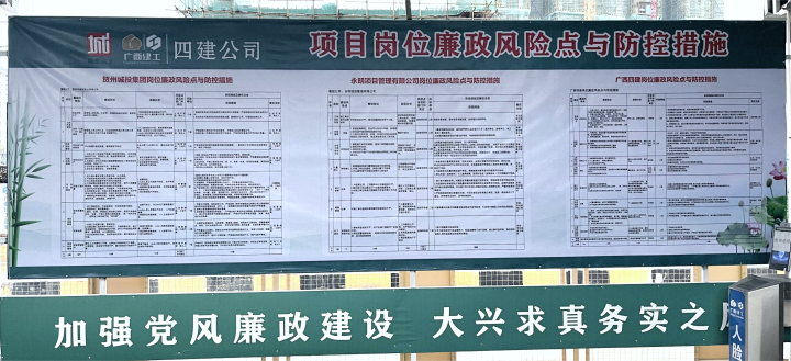 按照贺州“清廉国企”建设工作部署,贺州城投实业公司以严格把控项目“质量、进度、投资、安全、廉洁”为目标,构建党建领廉、制度强廉、文化育廉、项目立廉“四位一体”的“清廉项目”建设模式,把廉洁理念融入项目建设各方面、全过程,确保了项目优质、高效、安全有序推进。
