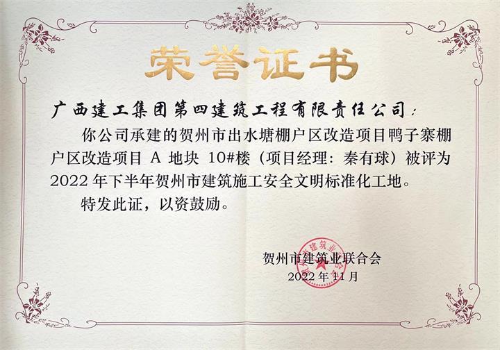 打造“高标准”文明工地。以标准化制度为主线,实现人员“进场流程、安全检查、安全设施、安全防护”标准化,建立13个在建项目微信交流群,每日报送项目建设情况,全方位推进文明工地建设。公司实施的平安居棚改项目、出水塘鸭子寨棚改项目均荣获“2022年下半年贺州市建设工程施工安全文明标准化工地”。