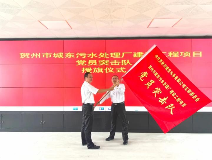 在活动现场,李罗清向党员突击队队员代表授旗,党员突击队队员代表作出承诺,表示将充分发挥先进性,确保出色完成贺州市城东污水处理厂建设工程项目各项收尾建设和调试运行工作。
