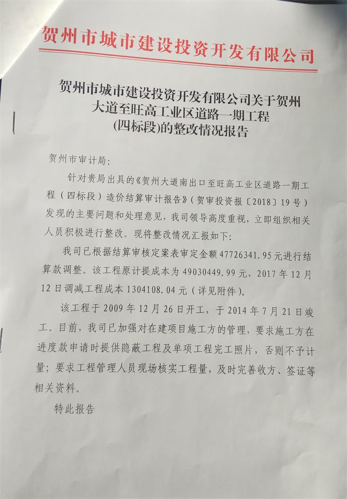 贺州市城市建设投资开发有限公司关于贺州市江南路网一期工程六、七标段审计发现问题整改情况的报告 pdf