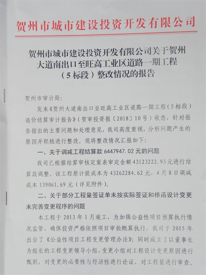 附件一:关于贺州市灵峰大桥工程建设项目竣工决算审计整改情况的报告 pdf